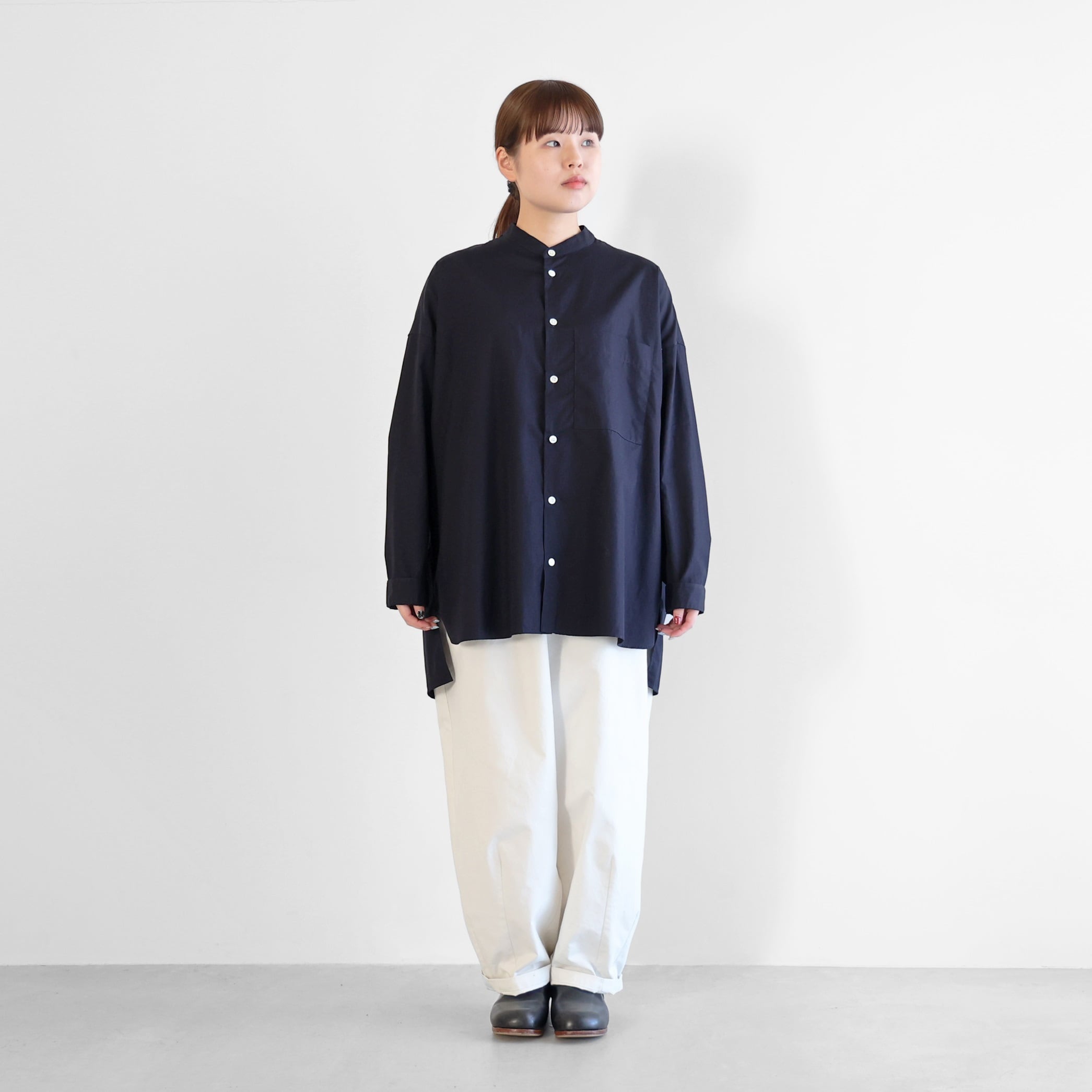 バンドカラーのすっきり感と、オーバーサイズのゆったりとした雰囲気が魅力のシャツです。