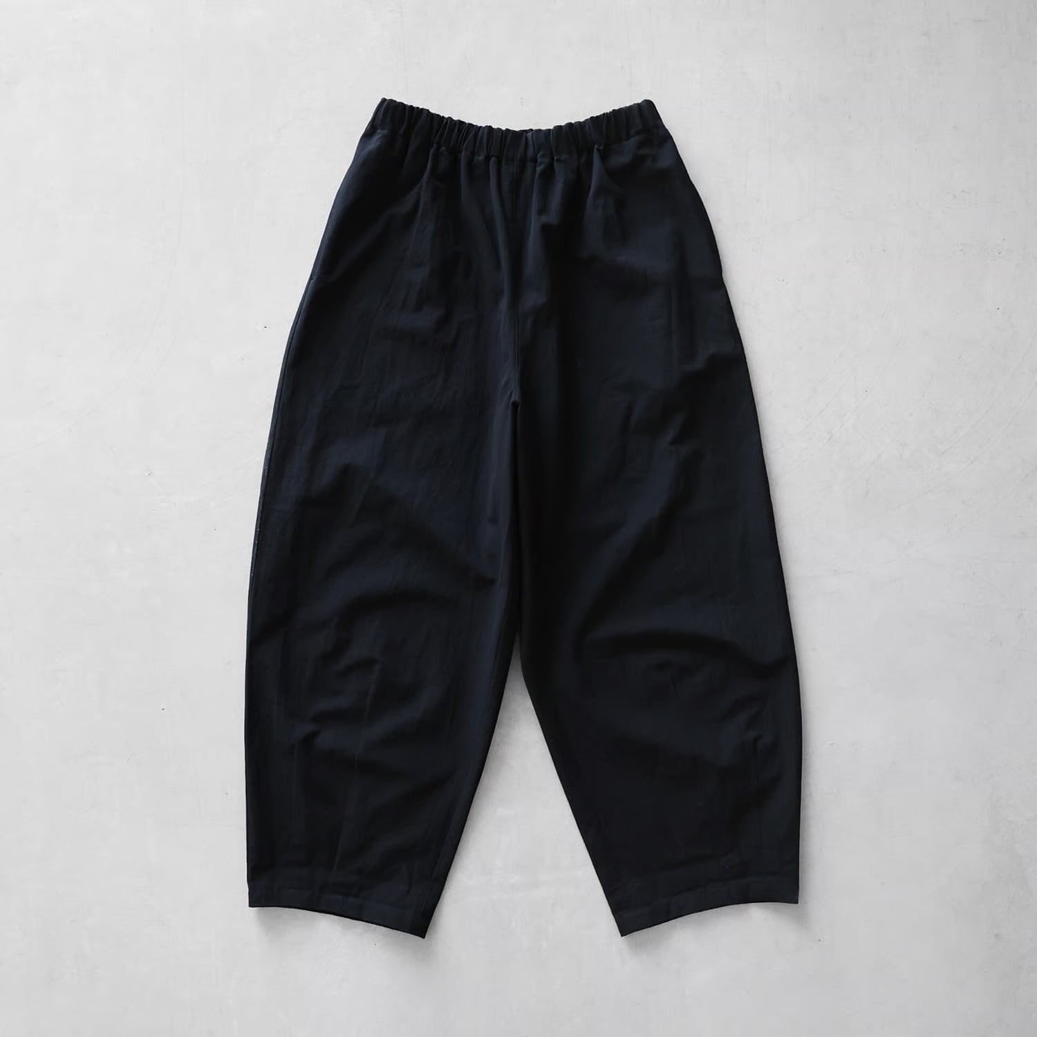 HUIS定番バルーンパンツのロング版です。 タテ糸にギザコットン、ヨコ糸にヘンプを用い、糸に負担をかけずに織り上げたコットンヘンプ生地を使用しています。 ウエストはゴムと紐仕様なので、どなたでもゆとりを持って着用できます。 ※ヘンプ素材の特性上、ネップやムラがある場合がございます。 【Color】 ブラック 【Material】 cotton 75%, hemp 25% 【Size】 ウエスト75 / 股上37 / 股下61 / 腿幅35 / 裾幅23 cm (ウエストゴム最大幅96cm)