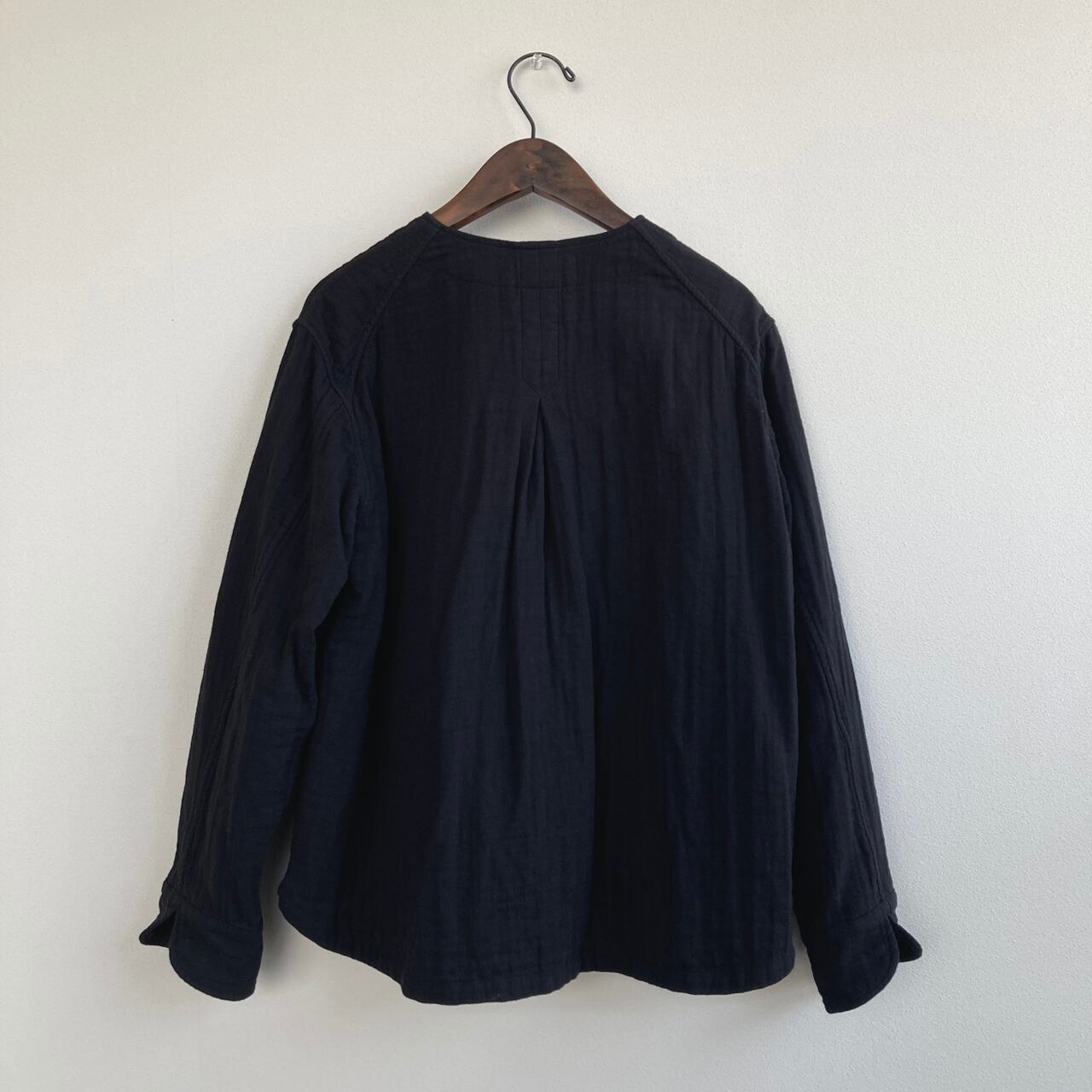 すっきりとしたノーカラーの襟元から、お気に入りのインナーをのぞかせても素敵です。